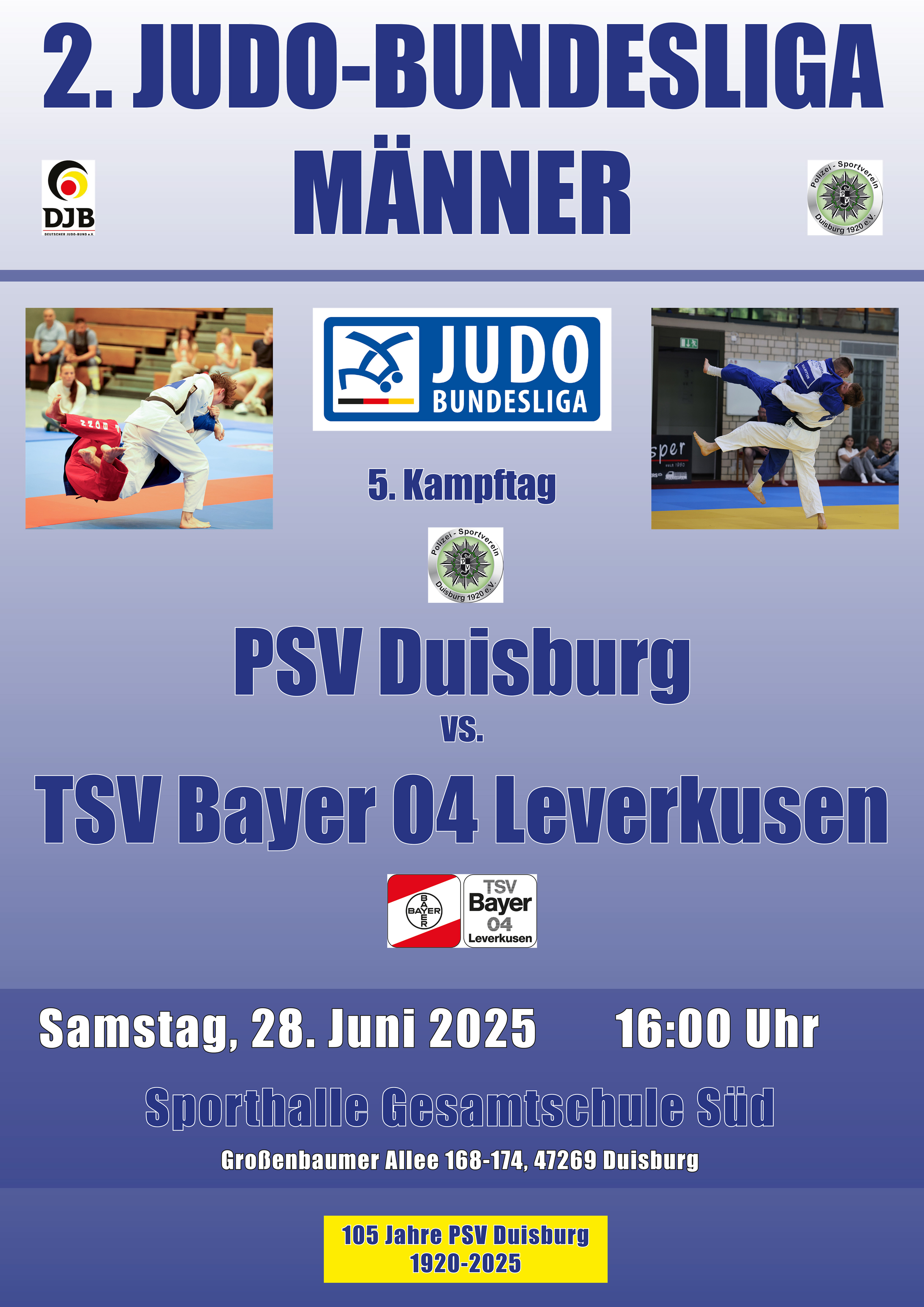 Am fünften Kampftag der 2. Judo-Bundesliga der Männer empfängt Aufsteiger PSV Duisburg die Mannschaft von Tabellenführer TSV Bayer 04 Leverkusen. In zwei Durchgängen werden jeweils Kämpfe in sieben Gewichtsklassen absolviert.