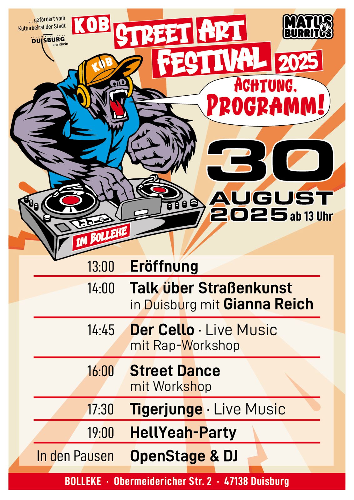 Auf der Bühne eröffnet ein Gespräch über die Straßenkunst in Duisburg mit der bekannten Künstlerin Gianna Reich das Festival. Zudem sorgen zwei Hip-Hop-Künstlerinnen mit Show und Mitmach-Workshop für Bewegung. Dazu gibt es Live-Musik und einen Rap-Workshop mit "Der Cello", während drinnen beim Siebdrucken unter dem Motto „Bring your own shirt“ eigene Kleidung mit dem Festival-Logo veredelt werden kann.