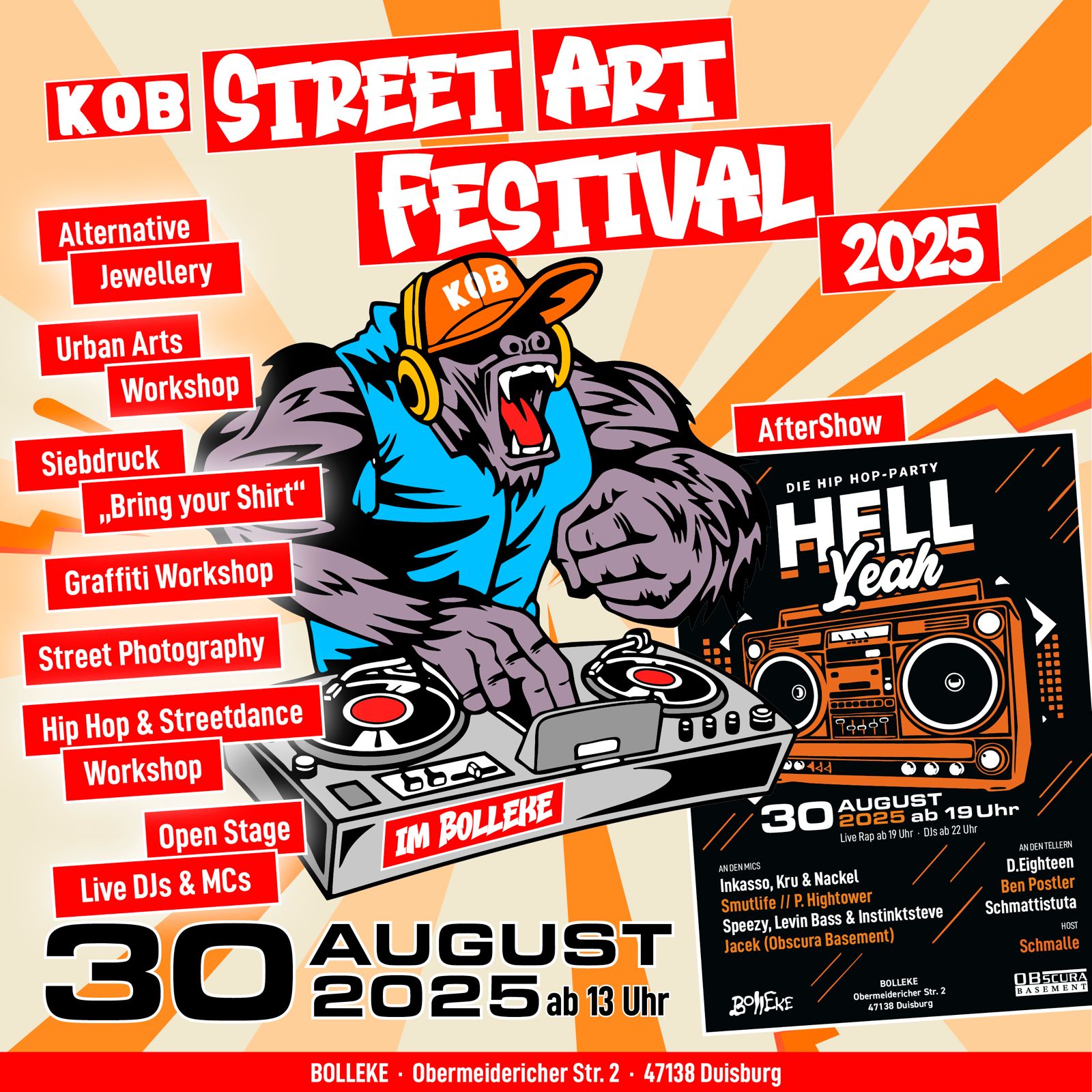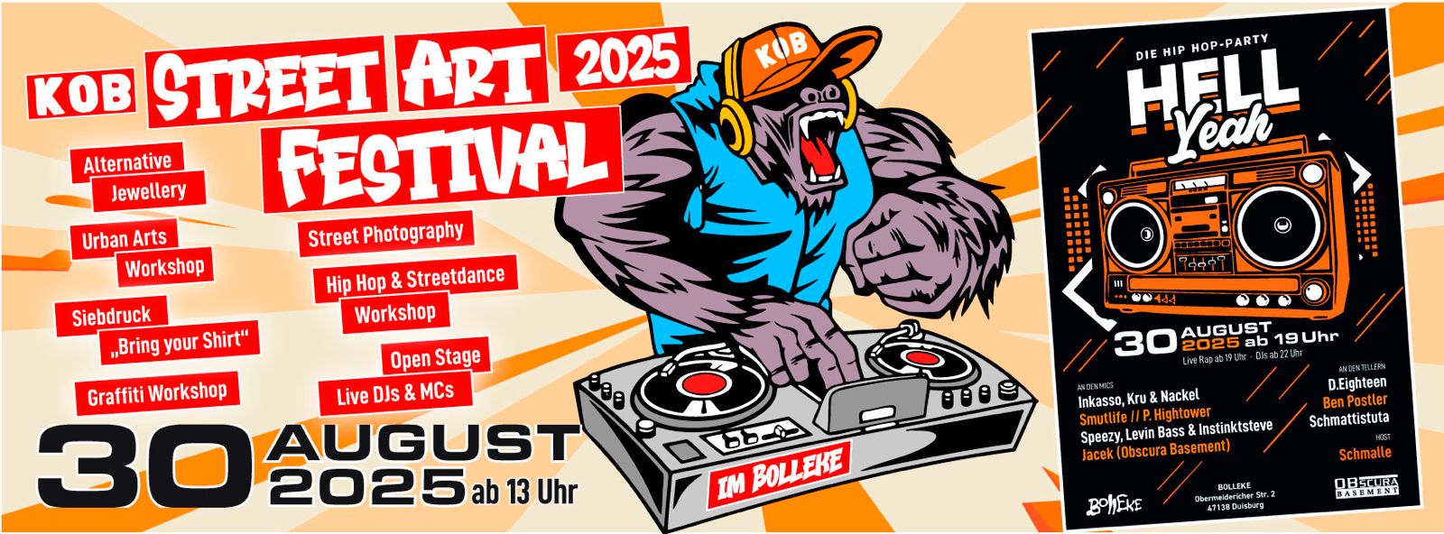 Am 30. August wird es wieder bunt: Das KOB Street Art Festival geht in die zweite Runde und bringt Kunst, Musik und Kreativität in das Bolleke. Besucherinnen und Besucher jeden Alters erwartet ein vielseitiges Programm – von Graffiti- und Siebdruck-Workshops über Live-Musik und Tanzshows bis hin zu inspirierenden Talks.