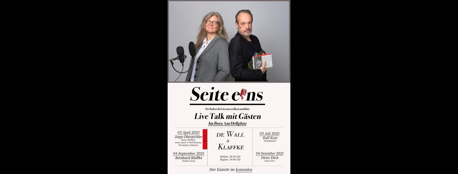 Daniela de Wall ist Moderation der Sendung Dunkelweiss im Duisburger Bürgerfunk und hat 2023 den Bügermedienpreis NRW mit ihrer Moderation gewonnen, Bernhard Klaffke Duisburger Autor und ehemaliger Galerist der Galerie 9/46. Beide haben sich nun zusammengetan und werden die Veranstaltung „Seite 1 - Der Literaturpodcast für Literatur an Rhein und Ruhr“ moderieren. Ein Literaturpodcast der als Live Mitschnitt aufgezeichnet wird. 4mal im Jahr ist die Reihe geplant. Gestartet wird in diesem Jahr im Bora am Dellplatz, im nächsten Jahr geht es dann in einer anderen Duisburger Location weiter. De Wall und Klaffke laden bei Ihrer Veranstaltung jeweils eine/n Autor*in aus der Region ein und gestalten mit diese/r/m eine knappe Stunde live Unterhaltung. Etwas später ist der Podcast dann im Bürgerfunk bei Radio Duisburg und bei Nrwision.de zuhören.