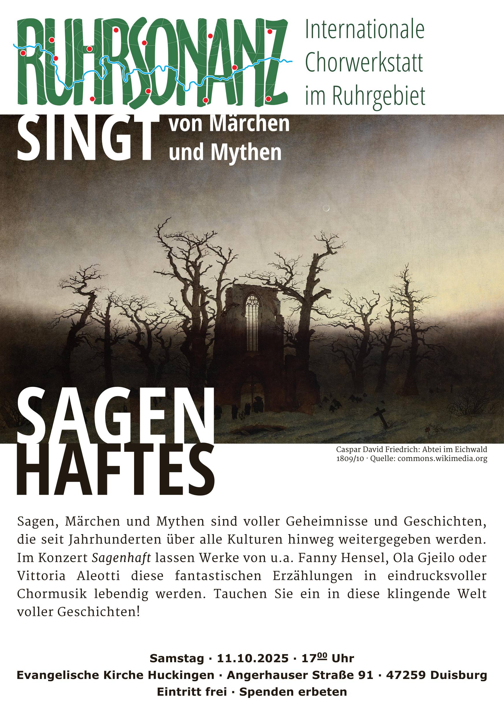 Am Samstag, 11. Oktober 2025, um 17 Uhr lädt Ruhrsonanz in die Evangelische Kirche Huckingen (Angerhauser Str. 91, 47259 Duisburg) ein. Unter dem Titel Sagenhaftes erklingen Werke von unter anderem Fanny Hensel, Ola Gjeilo und Vittoria Aleotti.